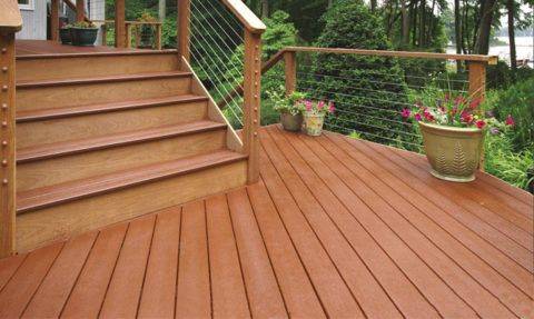 - Не хотите тратить время на обработку и покраску? Замените древесину при изготовлении ступеней древесно-полимерными плитами – террасными досками. Измельченную древесину смешивают с пластиковыми гранулами по специальной технологии. Полученный материал устойчив к воде, ветру, механическим ударам, трещинам и сколам. В период эксплуатации не требуется красить или лакировать. Преимущество ДПК в том, что производители предлагают не только сами плиты, но и элементы дизайна и маскировочные стыки в широкой цветовой гамме.