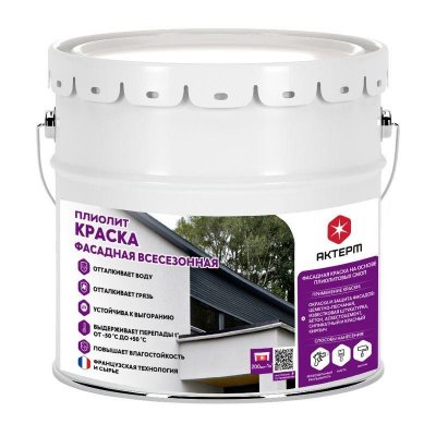 Плиолитовая краска, в отличие от масляных, алкидных и акриловых красок, скрепляет основу. Они проникают в поры бетона, кирпича и действуют как поверхностное покрытие и грунтовка. Оптимальный вариант – Актерм Фасад Плиолит. Главная особенность краски – использование на протяжении всего сезона. Вам не нужно ждать теплой погоды, чтобы покрасить дом. Краску можно наносить при температуре до -20°С. Высокая адгезия к бетонным и оштукатуренным поверхностям обеспечивает равномерное и прочное покрытие, устойчивое к влаге, перепадам температур и ультрафиолетовому излучению. Срок службы до 15 лет даже при неблагоприятных условиях. Для российского климата с перепадами температур и холодной зимой это лучшее решение.