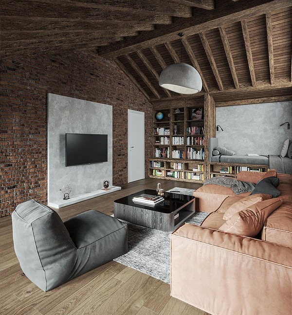 Уютное тепло дерева нейтрализует грубый характер бетона и металла. В сочетании с деревом также будет гармонировать кирпич или плитка. Их оставляют в естественном терракотовом оттенке или окрашивают в белый, серый и другие цвета. Допускаются и яркие цветовые акценты: на фоне фактурных материалов они будут смотреться смело и уместно.