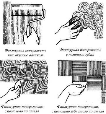 Фантазия дизайнеров помогла получить разные эффекты, используя рельефные виды красок. Инструмент важен для поставленной задачи. Могут применяться кисточки, рельефные валики, где узор сразу виден. Шпатель тоже подходит. Различные губки, бумага или газета, которую хорошо сминают, чтобы обработать поверхность для узорчатого покрытия. Кроме того накрутив на валик веревку, получают необычный слой, который схож с бамбуковым рисунком.
